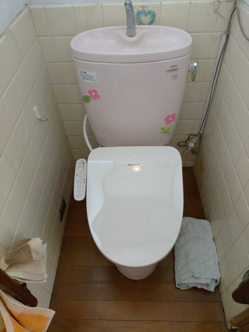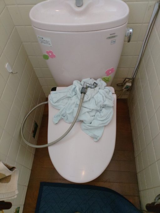 確認すると温水洗浄便座からの水漏れで、今からあと2年ほどしか住まないため安価で直せるものがあればとのことで、別の温水洗浄便座をお選びいただき、取り返させていただき作業終了です。